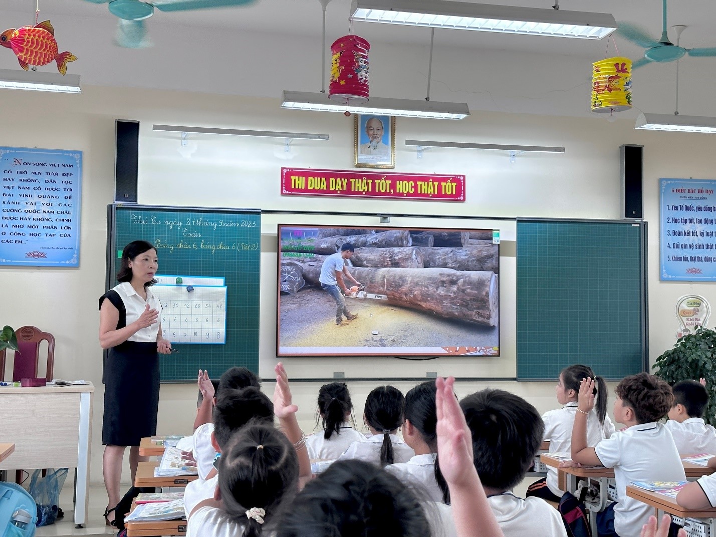 Với sự chuẩn bị chu đáo, cô giáo Nguyễn Thị Oanh đã thực hiện tiết dạy diễn ra hiệu quả, nhẹ nhàng dưới sự hướng dẫn nhịp nhàng, mạch lạc của cô giáo. Ngoài các hoạt động cốt lõi đặc trưng của tiết Toán là thực hiện các dạng bài toán liên quan đến bảng nhân 6, bảng chia 6 cô giáo còn khéo léo lồng ghép, tích hợp bài học Stem+ vào tiết học khiến học sinh rất hứng thú và say mê trong giờ học.