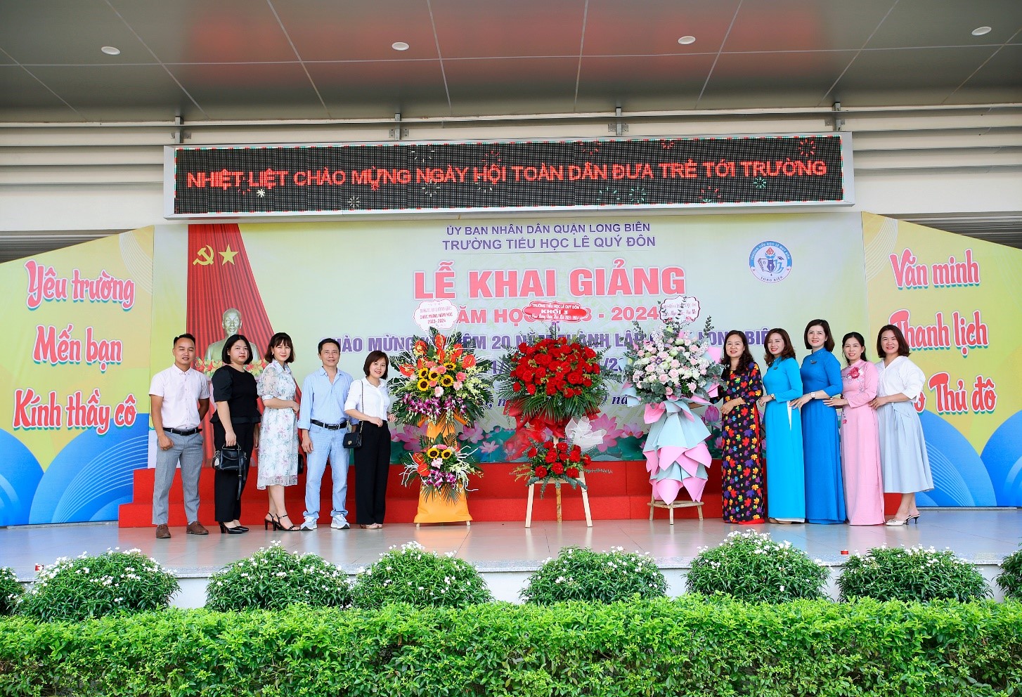 Cảm ơn các bác bí thư chi bộ, tổ trưởng dân phố, các đơn vị hợp tác của nhà trường đã quan tâm, giúp đỡ. Cám ơn các bậc Phụ huynh luôn đồng hành cùng nhà trường suốt 2 năm học vừa qua. Cảm ơn các cơ quan, đoàn thể, cá nhân đã gửi quà, hoa chúc mừng nhân dịp ngày khai trường.