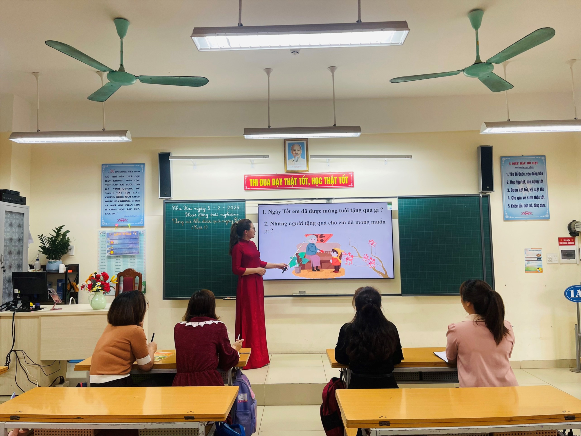 Trong không khí hân hoan chuẩn bị đón Tết, bài dạy “Ứng xử khi được nhận quà ngày Tết” thật sự phù hợp và chuẩn bị tâm thế tốt cho các con học sinh trong dịp này. Bài dạy của cô giáo được chia thành ba hoạt động rõ ràng với các bước làm việc hết sức uyển chuyển, nhịp nhàng. Trong hoạt động 1 “Người thân mong muốn gì khi tặng quà cho em?”, cô giáo đã giúp cả lớp hiểu được ý nghĩa của ngày Tết cổ truyền, nắm được những hoạt động thường diễn ra trong dịp Tết và đặc biệt, các con đã hiểu được mục đích của việc mừng tuổi, tặng quà vào dịp này đó là mong mọi điều tốt lành đến với muôn người. Thông qua các bức tranh, học sinh đã nêu được nội dung và ý nghĩa của từng việc làm, từ đó rút ra được kết luận đúng đắn sau hoạt động 1.