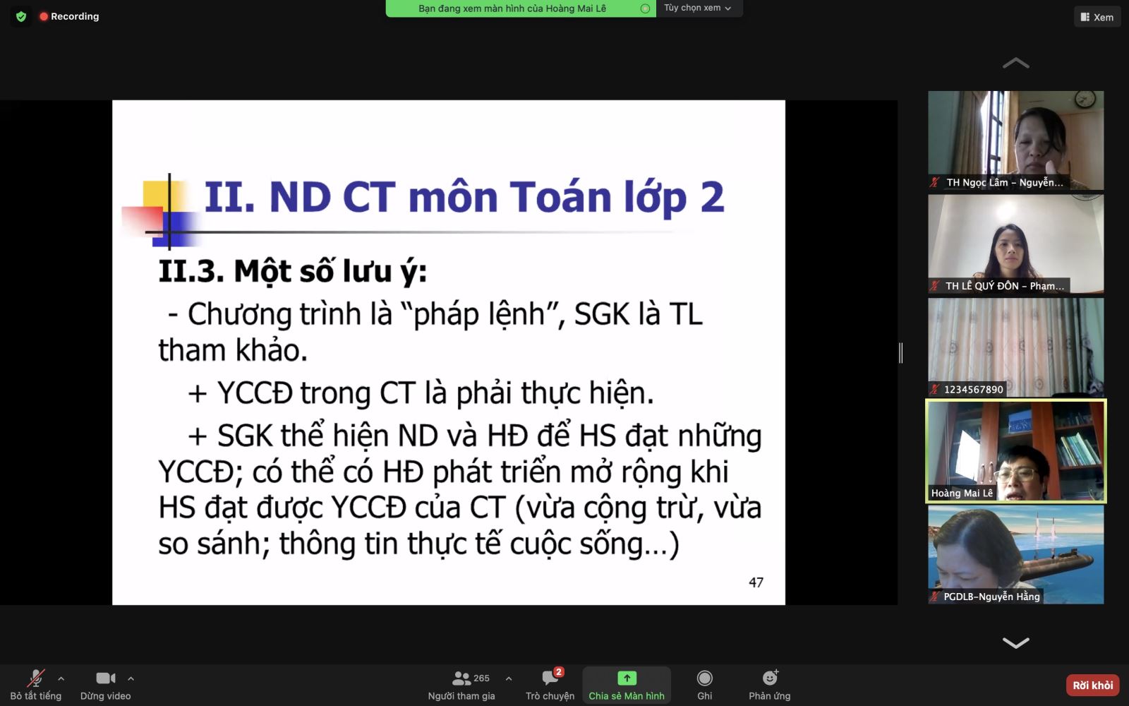 Trong buổi tập huấn trực tuyến, GV đã được nghe giáo sư giảng về các nội dung như: CT Toán TH CTGDPT 2018; ND CT môn Toán; XD KHBD môn Toán lớp 2; XD bài học theo chủ đề; Chỉ đạo, tổ chức XD KHDH CTGDPT 2018 cấp TH.