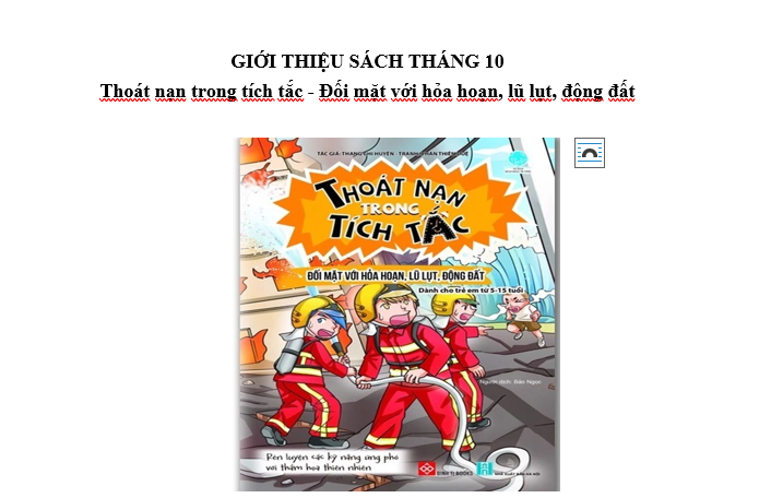 Trong buổi giới thiệu sách hôm nay, thư viện nhà trường xin trân trọng giới thiệu tới thầy cô và các bạn cuốn sách Thoát nạn trong tích tắc – Đối mặt với hỏa hoạn, lũ lụt, động đất, sách do tác giả Thang Chi Huyên, tranh vẽ bởi hoạ sĩ Phàn Thiên Duệ.
