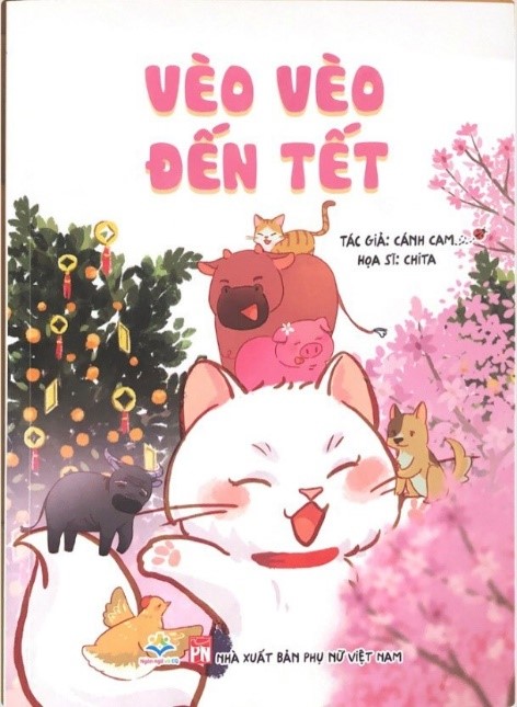 Học sinh chúng mình thì vừa trải qua một kì thi học kì với nhiều cố gắng, nỗ lực và có thật nhiều bông hoa điểm tốt, đúng không nào? Ở trên khắp các phố phường là khung cảnh tấp nập của những chợ hoa, cây cảnh, quầy hàng bán đồ Tết. Tết - không chỉ là ngày hội của sắc màu: màu đỏ tươi của hoa đào, màu vàng của cành mai, màu xanh của bánh chưng...mà Tết còn là mùa của yêu thương và hạnh phúc ngập tràn. Để có cái nhìn đầy đủ hơn những nét văn hóa đặc sắc của Tết cổ tuyền dân tộc, thư viện Trường Tiểu học Lê Quý Đôn xin gửi đến quý thầy cô giáo và các bạn học sinh cuốn sách: “Vèo vèo đến Tết” của tác giả Cánh Cam và họa sĩ Chita do nhà xuất bản Phụ nữ Việt Nam thẩm định và xuất bản năm 2022, với độ dày 83 trang. Sách được in 2000 bản, khổ sách 17 x 24 cm. Trang bìa cuốn sách được thiết kế thật bắt mắt với gam màu hồng tươi sáng, ở giữa là hình ảnh một chú mèo xinh xắn đang cười vui vẻ với các bạn trong thế giới loài vật; bên trái là cây quất được trang hoàng lộng lẫy với những câu đối, bao lì xì; bên phải là cành đào phai tươi thắm, chỉ cần nhìn thôi, đã thấy cả bầu trời “Tết” đang ùa về thật gần, thật gần...